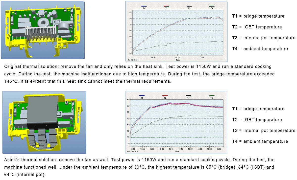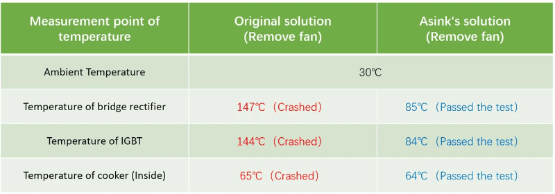 Conclusion: With the original solution, the test was suspended in 20 minutes because the temperature of components was too high, and might get higher if the test didn't suspend. With Asink's thermal solution, the machine can finish one standard cooking process to satisfy the customer's need.