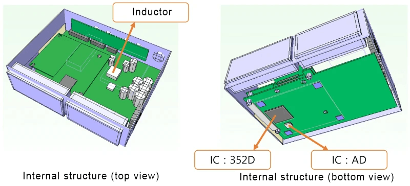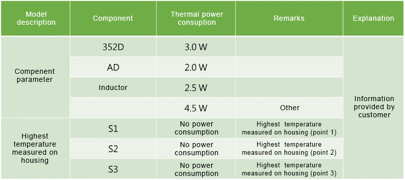 An active thermal design plan is required, including the specification and the airduct design of the fan. The customer demands that at the ambient temperature of 30℃, after the test, the temperature of appointed component should not be higher than 70℃ (or the rise of temperature should be less than 40℃), and the temperature of the shell should not be higher than 45℃ (or the rise of temperature should be less than 15℃). The thermal simulation model below is built based on the product information provided by the customer.
