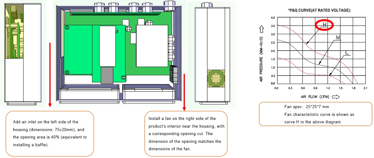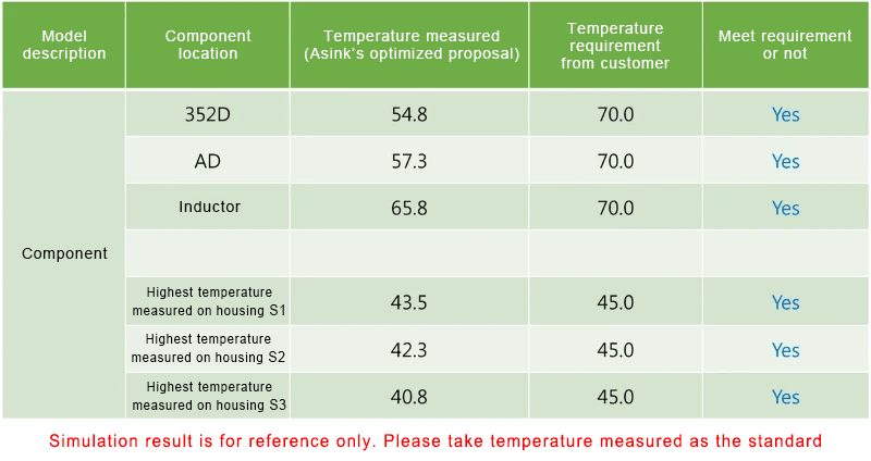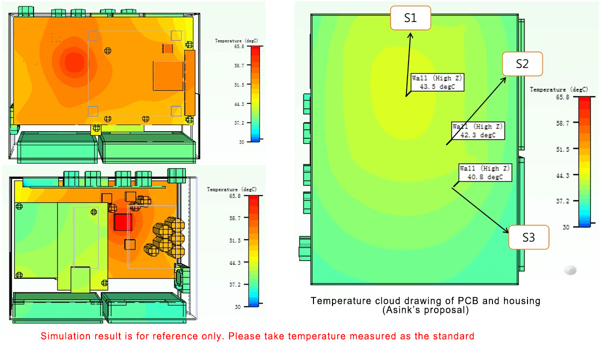 Conclusion: With Asink's optimized thermal solution (add the fan, air duct and open holes on shell), the temperature can be controlled under 70℃(or the rise of temperature is less than 40℃). The temperature of shell isn't higher than 45℃ (or the rise of temperature isn't higher than 15℃). Therefore, we can see that Asink's solution can satisfy the customer's need.